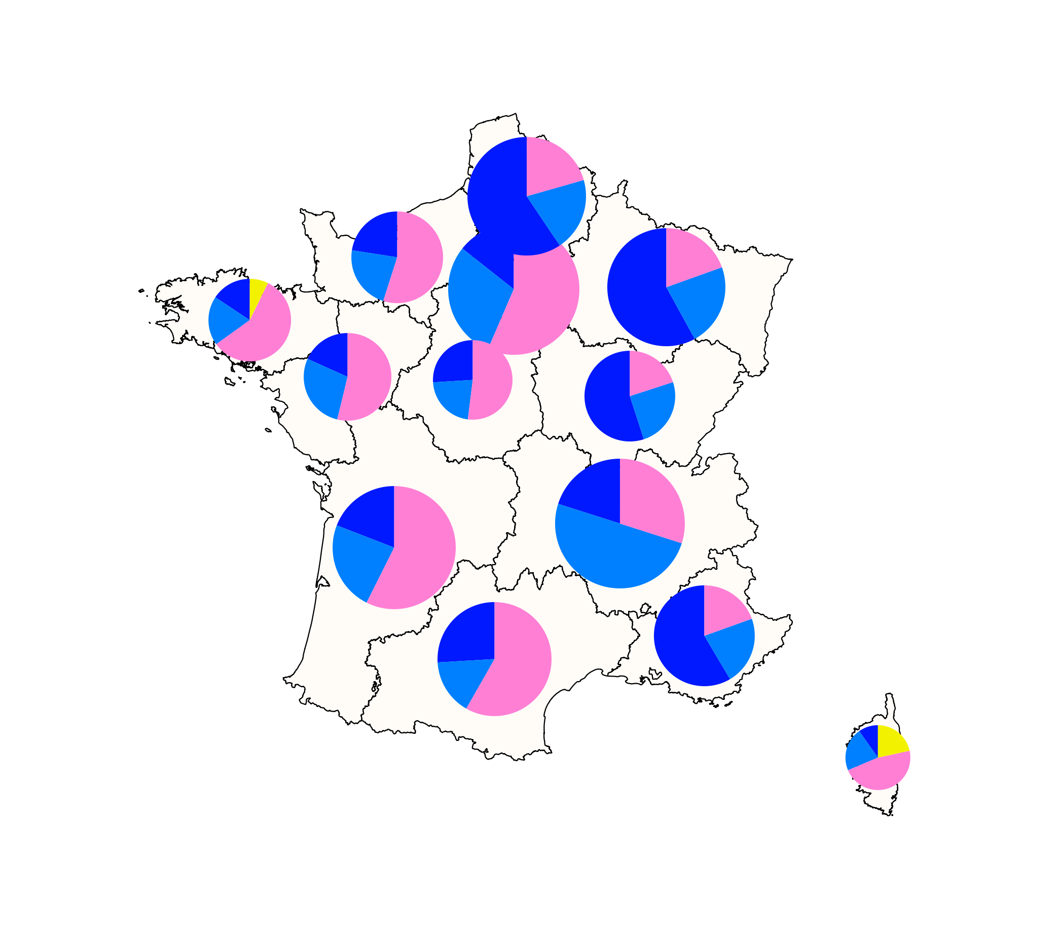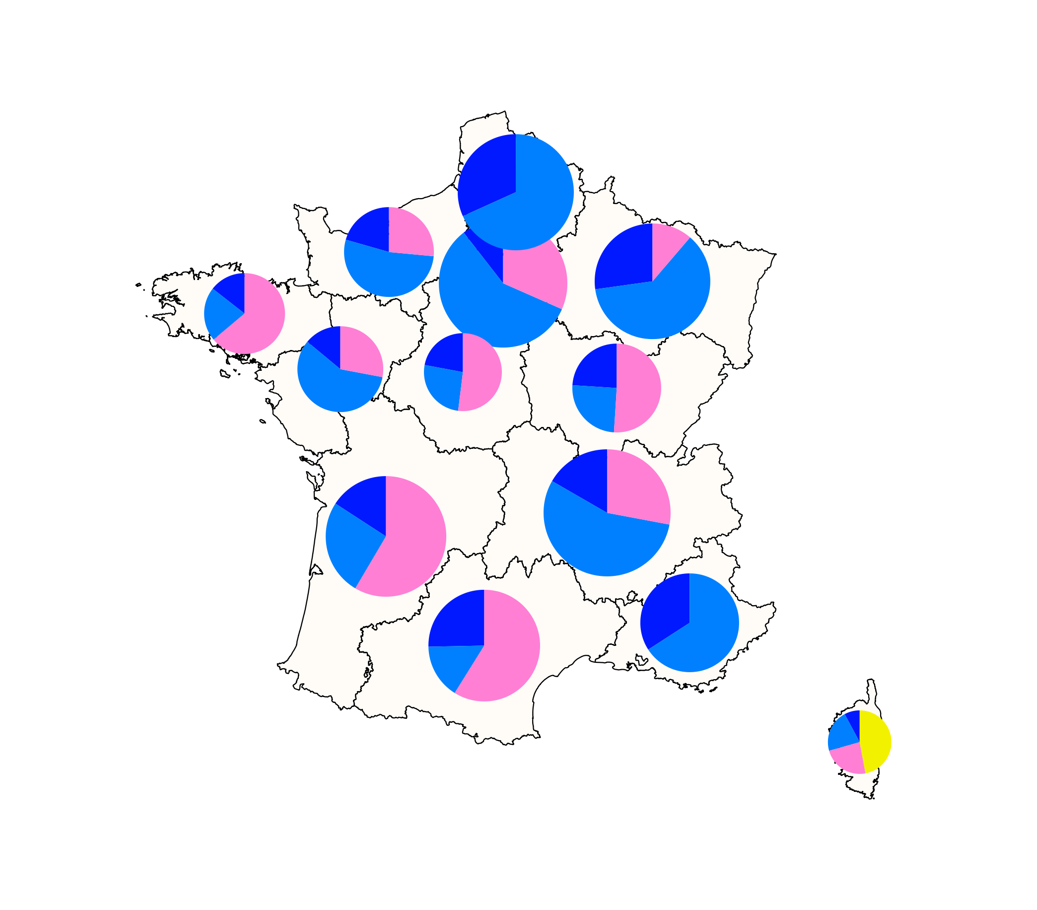 J’ai ensuite exporté les résultats sous QGIS. J’ai simplement effectué une jointure et utilisé la fonction “Diagrammes” pour réaliser les demi-camemberts ci-dessous. Le demi-cercle représente l’assemblée d’un conseil. On obtient un demi-cercle en incluant une colonne “total” pour chaque région à laquelle on assigne une opacité nulle. Il est également possible d’afficher un histogramme à la place. Avec Illustrator, j’ai empilé les barres afin d’avoir une présentation plus compacte et plus intuitive, ci-dessous à droite.