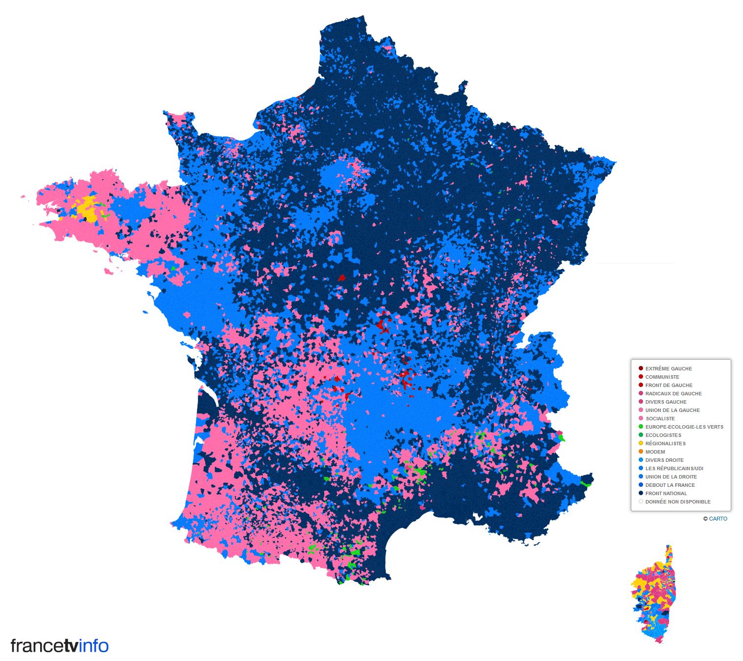 Sur la carte suivante, FranceTV présente les partis en tête au premier tour dans chaque commune lors des élections régionales de 2015. C’est un sujet qui m’a semblé intéressant pour trois raisons principales.
